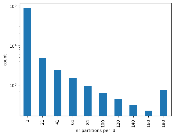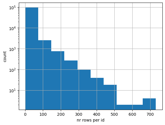 Below we can see the distribution of the number of rows per id. Note that the vertical axis is in log scale.